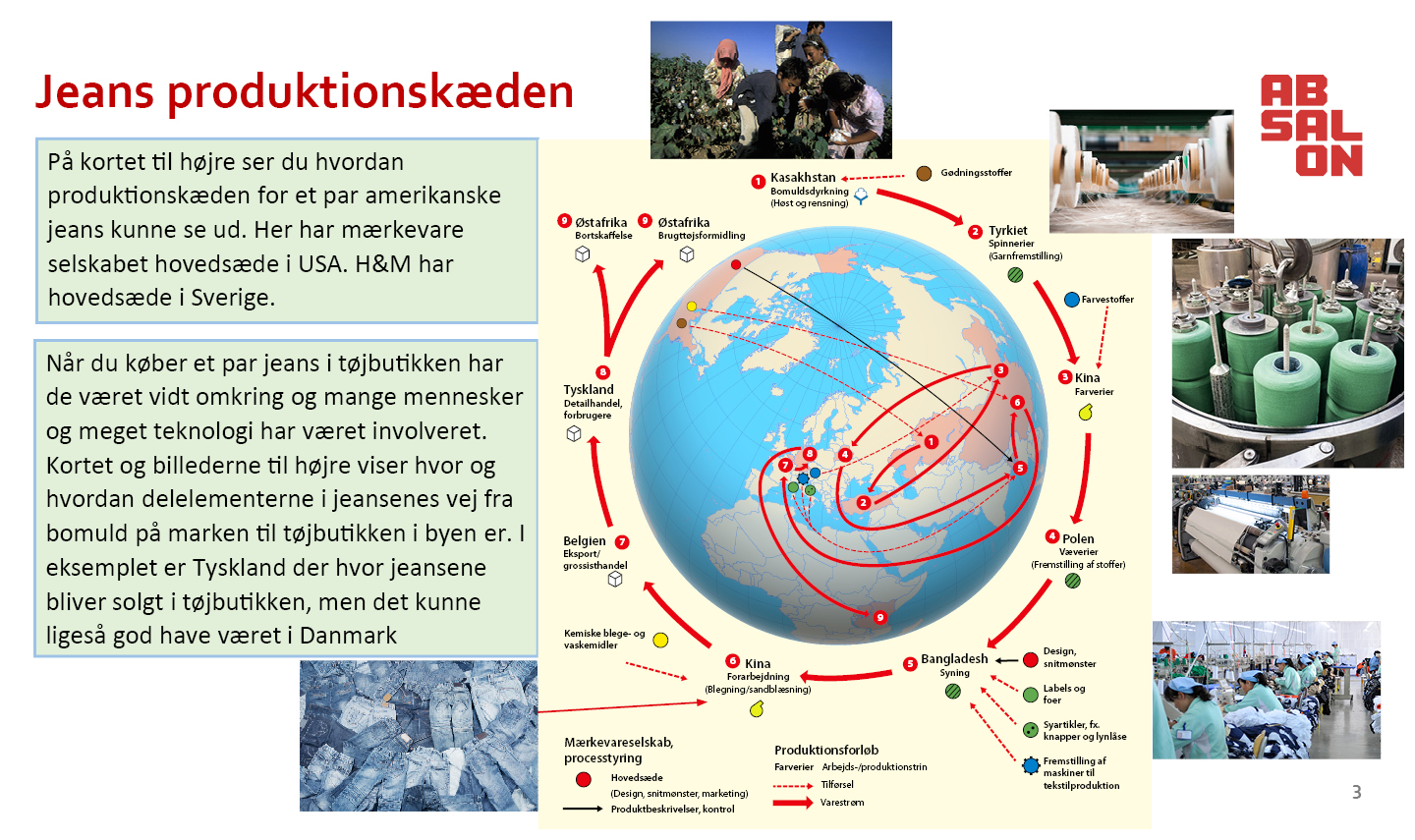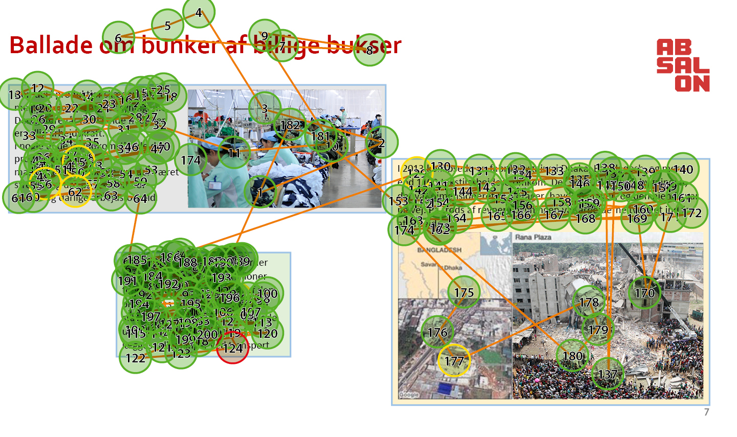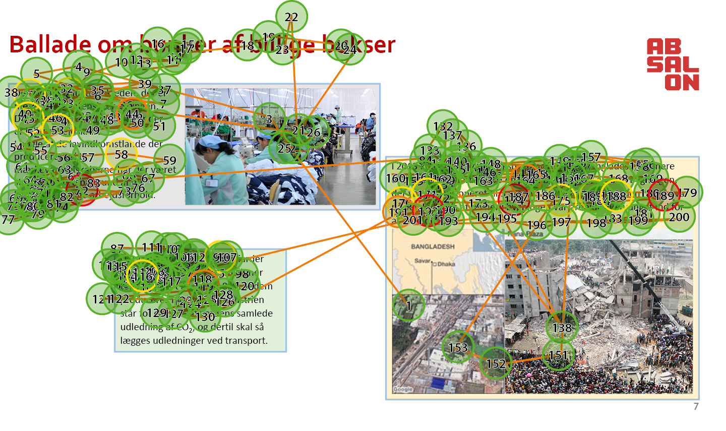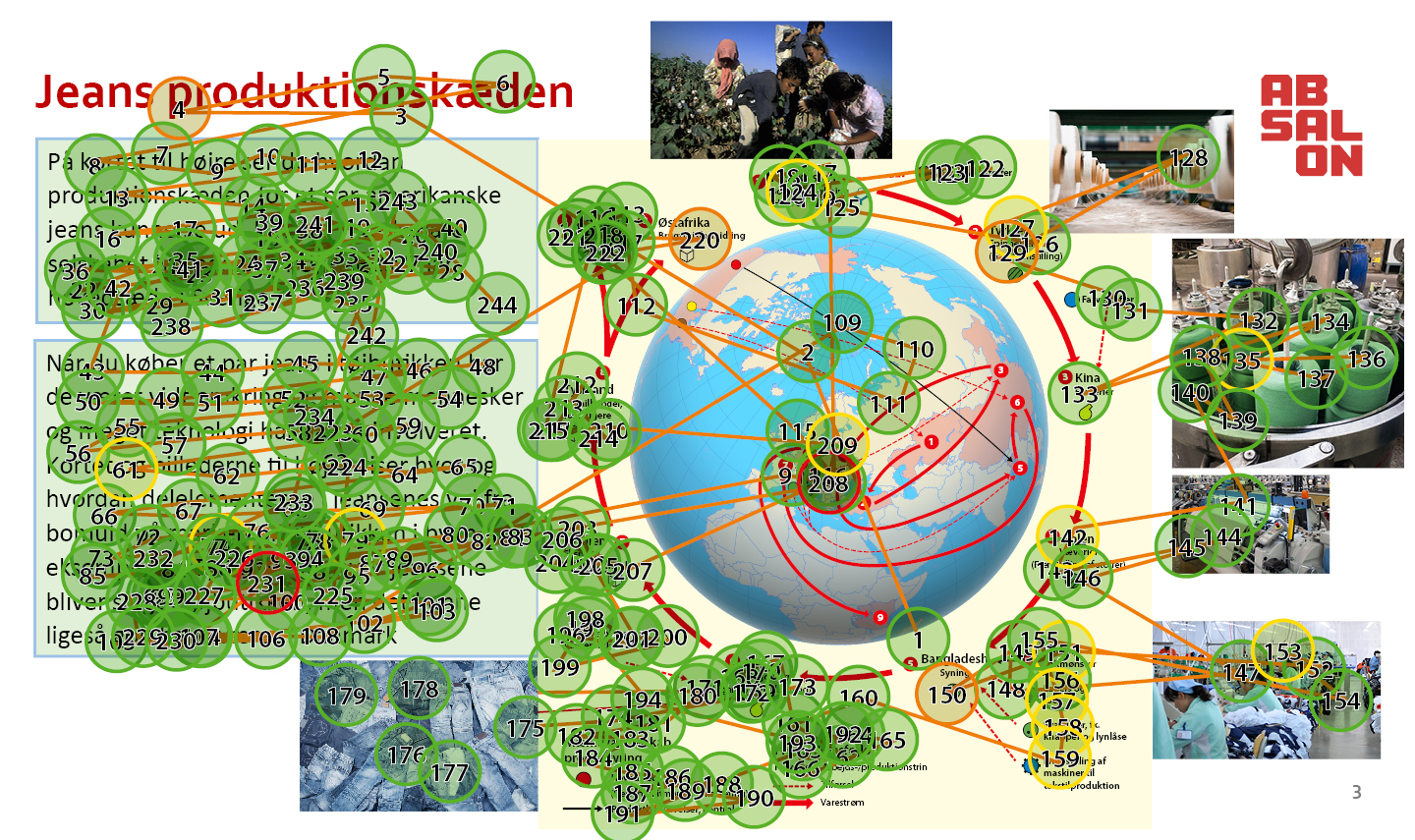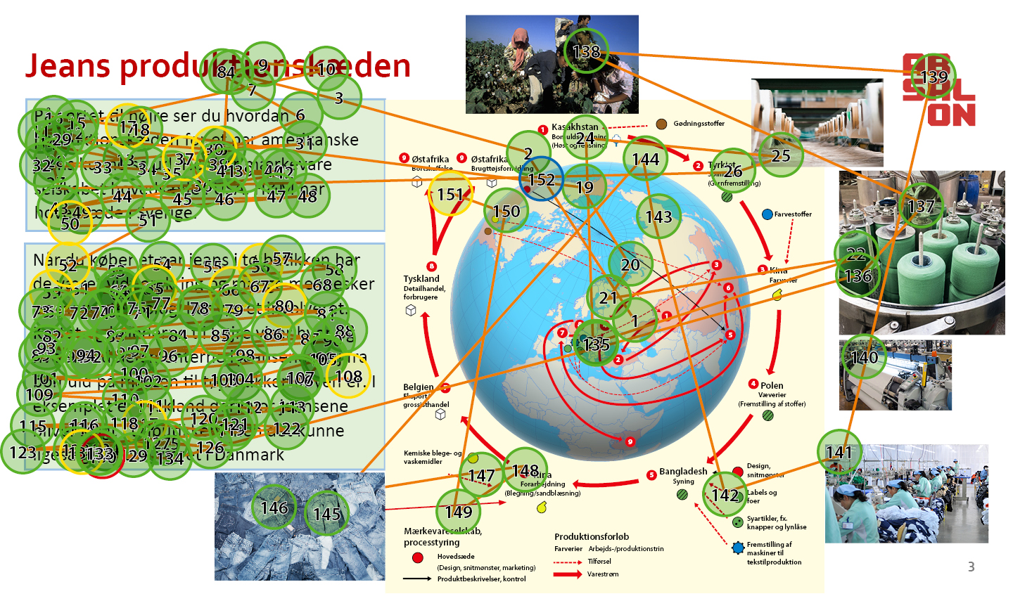 I afprøvningerne på mellemtrinnet blev eleverne præsenteret for ovenstående billede, som består af to rækker ikoner/flag med en kort forklarende tekst nedenunder om det, der sker med T-shirten det pågældende sted. Sammenhængen mellem ikonerne er vist med transport-ikoner (lastbil, tog og skib), som angiver bevægelsesretningen for transport af varen, men som også angiver læsestien. Bevægelsesretningen er i nederste række ikoner modsat den traditionelle læseretning. Eleverne læste i begge tilfælde som udgangspunkt den nederste række i den danske skrifts læseretning, og kun den sikre læser opdagede, at det skulle læses i omvendt rækkefølge.