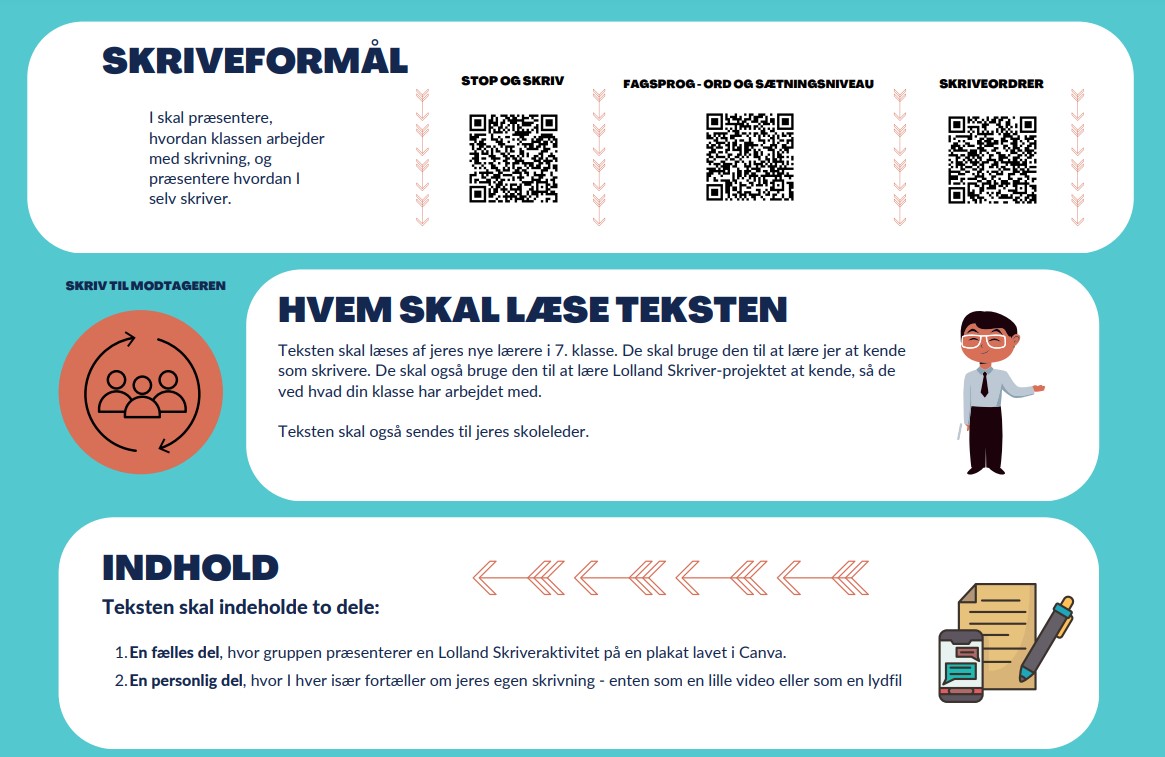 Lolland skriver handler generelt om skrivning i fagene, og i dette delprojekt om overgang fra 6. til 7. klasse brugte vi elevernes skrivning og tekster som fagligt omdrejningspunkt for overleveringen til 7. klasse. Konkret har eleverne i 6. klasse lavet multimodale tekster til deres nye lærere i 7. klasse, og her kan du få inspiration til selv at arbejde med skrivning i overgange.