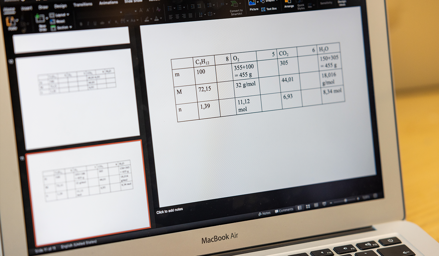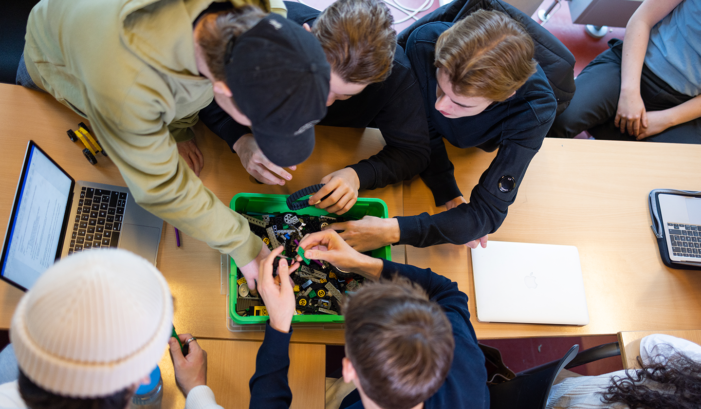 ”Lad kaos bryde lidt ud. Vis mig jeres bud på en løsning!” I 2.x har kemilærer Peter Olsen forsynet eleverne med kasser med legoklodser. Første punkt på dagsorden er at bygge ens og forskellige figurer med klodserne, ændre på dem og veje dem for at få en fornemmelse af, hvordan molekyler fungerer. Arbejdet med forforståelsen er en indgang til at læse en svær fagtekst om reaktionsskemaer. Peter forklarer hvorfor: ”Denne her tekst er altid svær for eleverne, men den er en hjørnesten i det, de skal lave det næste halve år,” og han fortsætter: ”Det hjælper dem at have noget i hænderne, noget konkret at røre ved og flytte rundt på. I min undervisning refererer jeg mere tilbage til eksperimenter og figurer end til teksten. Derfor afprøver jeg forskellige måder at aktivere eleverne med konkrete eksperimenter og analogier til kemiens verden, før vi læser fagteksten. Vi arbejder jo hele tiden med noget, man ikke kan se med det blotte øje.”