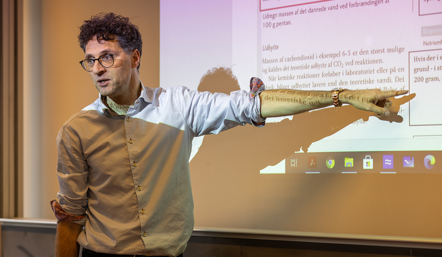 Kemilærer Peter Olsen introducerer eleverne til læseguiden, som består af spørgsmål og kommentarer, som han har indsat i fagtekstens margen.