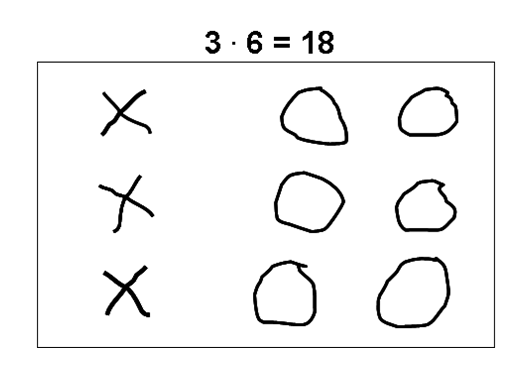 Samtale mellem lærer (L) og elev (E). E: - Jeg har taget 3 krydser og ganget med 6 boller. L: Ja, og … E: Det bli´r 18 …. L: 18 hvad for noget? E: ja, 18 af... Jeg kommer igen lige om lidt!!