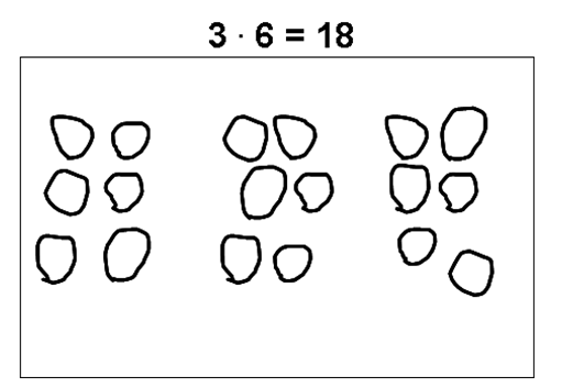 Anden samtale mellem lærer og elev. E: Nå, se nu. Nu er der 3 gange 6. L: Ja. Hvad mener du? E: Der er 3 gange 6 boller. Der er 18 boller i alt. Sådan!